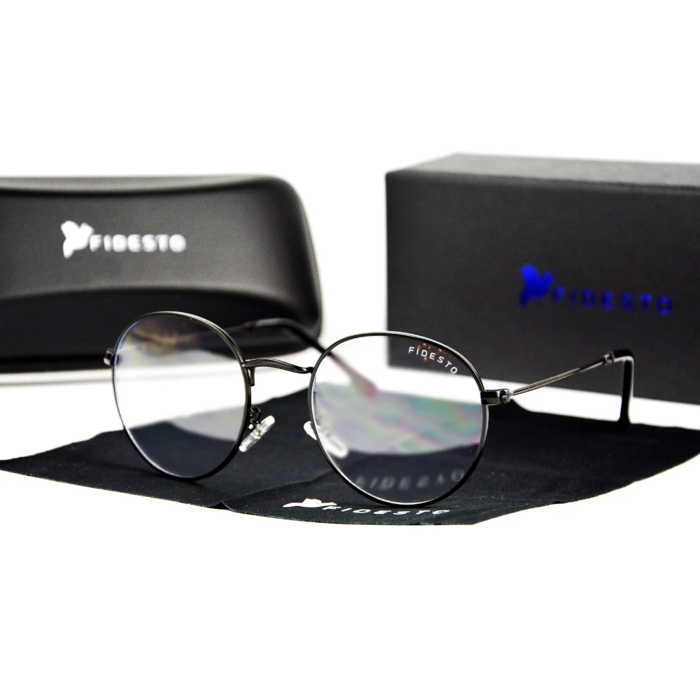 Okulary Zerówki z filtrem Anty Blue PREMIUM "Circle" Fidesto®, czarne. Idealne połączenie najwyższej jakości ochrony przed szkodliwym światłem niebieskim i wyjątkowego designu, tak aby prezentować się zjawiskowo i czuć komfortowo, nawet wiele godzin pracując przy ekranach.